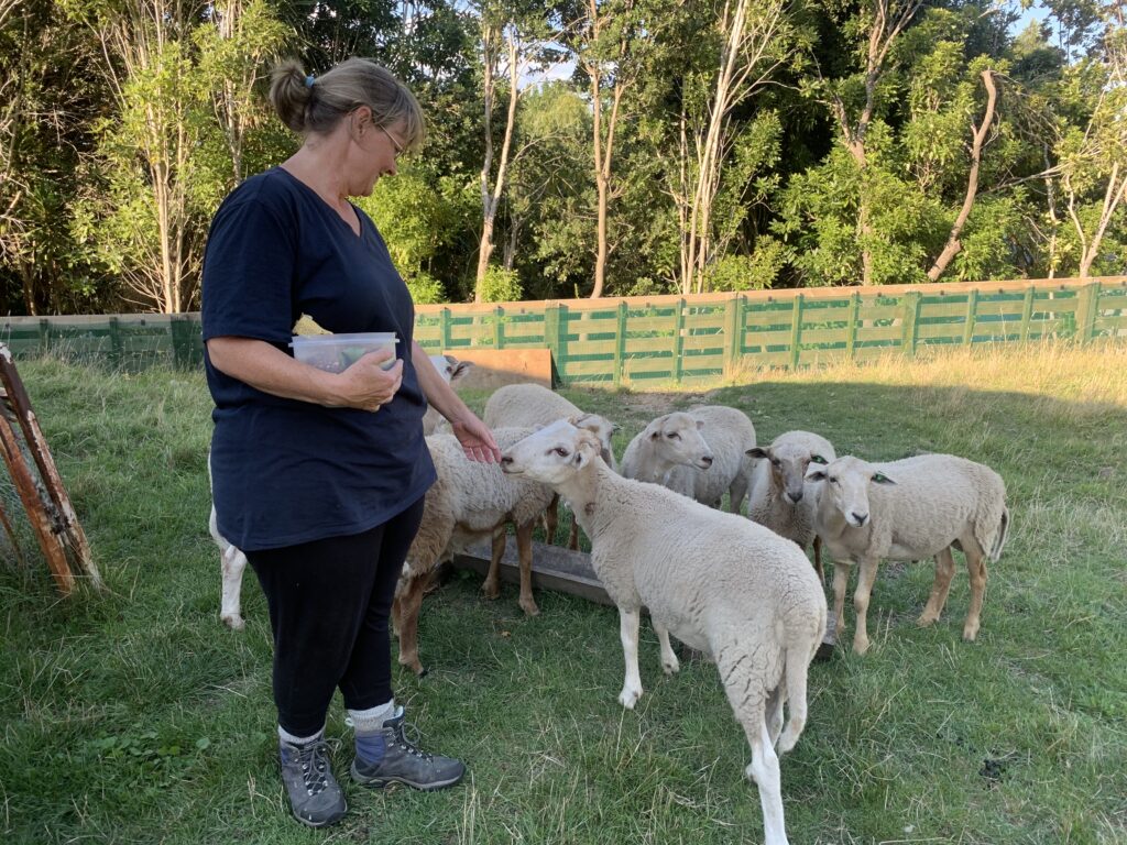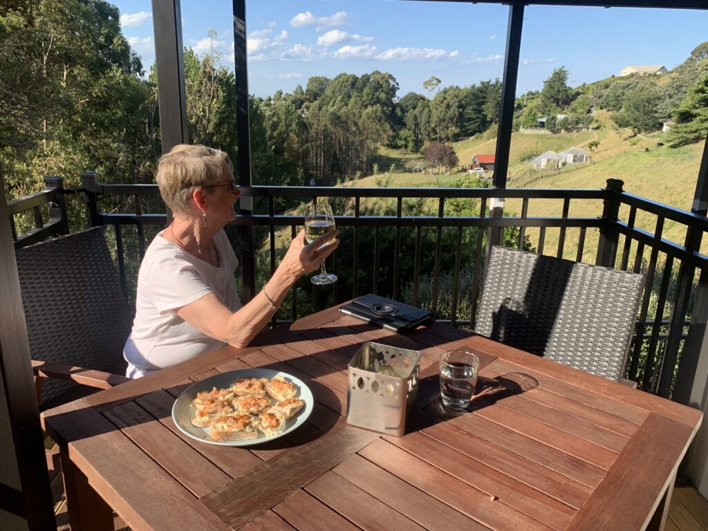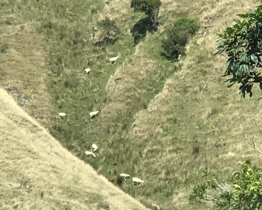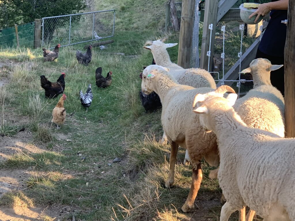 After a bit more than four hours of driving we neared Napier. We were booked into an Airbnb in the outskirts of town listed as a “lifestyle property”. We had no idea what that meant but at some point during the day we saw a development labeled that way… It must mean larger properties in a rural area. In any case, on we went driving up a rather steep hill, when less than 2 miles from our destination darkness decended on Siri. Yikes! I never have any idea where to go without her and unbeknownst to me the battery ran out. Dian’s phone still had a charge be she didn’t have the address. Thank goodness my daughter had given me and external battery pack that I had just charged up last night. A quick plug in on the side of the road and we were good to go. Up and around we went with the road becoming significantly narrower. Somehow we missed the house number, having to work our way to a driveway where we actually could turn around. Once we came back in the opposite direction it was easy to spot the correct drive. We were met by Nikki, the host. She showed us to a very modern apartment in the lower section of their house which is built on a steep hillside, so we look out across the farm fields. She and her husband have 5 acres where the raise sheep, a blend of Wiltshire and Damara and chickens. She was heading out to bring the chickens in for the night and allowed us to tag along. All the animals were a bit shy around us strangers, but they followed Nikki like she was the Pied Piper. She told us about the different breeds and how this mix doesn’t need to be sheared, it just naturally sheds.
