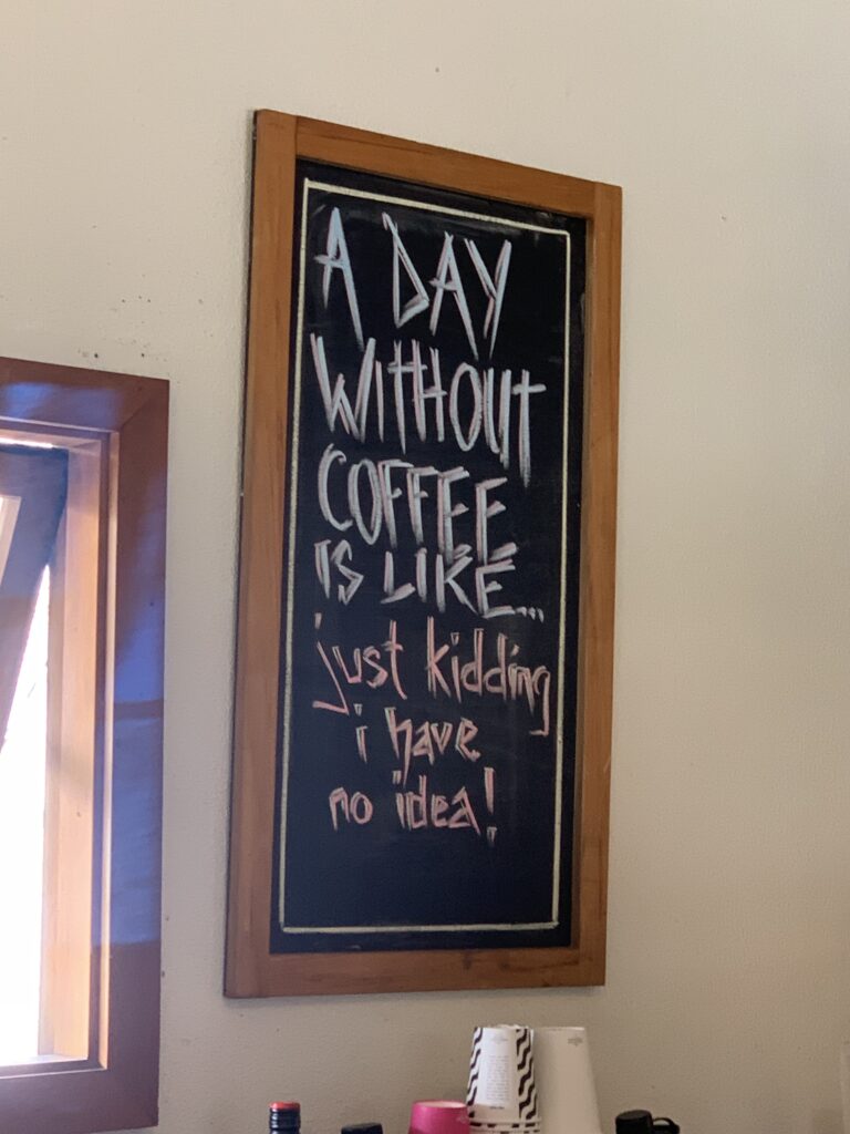 We found a cute little cafe on the outskirts of a small town and popped in for coffee for me and hot chocolate for Dian. We enjoyed it out in a lovely enclosed garden, chatting with a few fellow patrons. We liked the look of their food so we ordered dinner takeaway, as they say here.