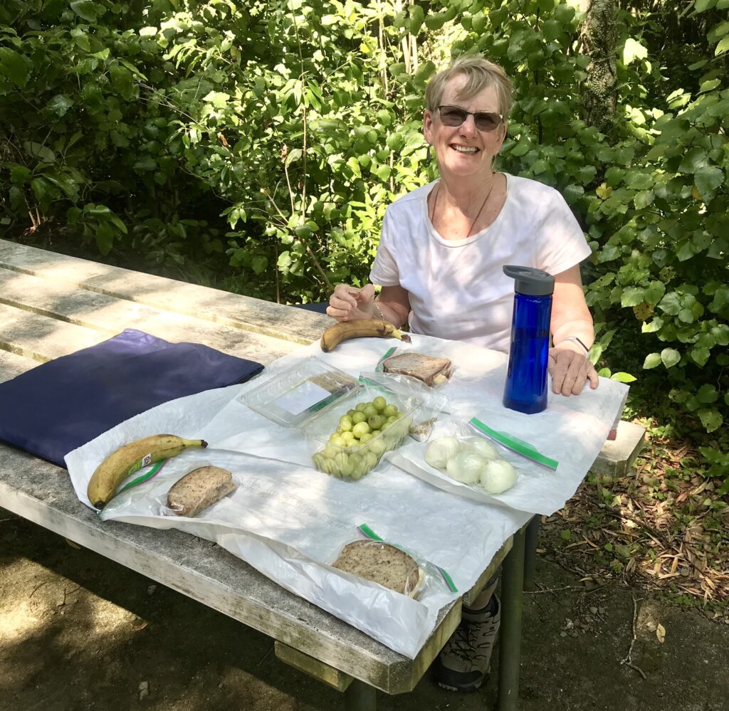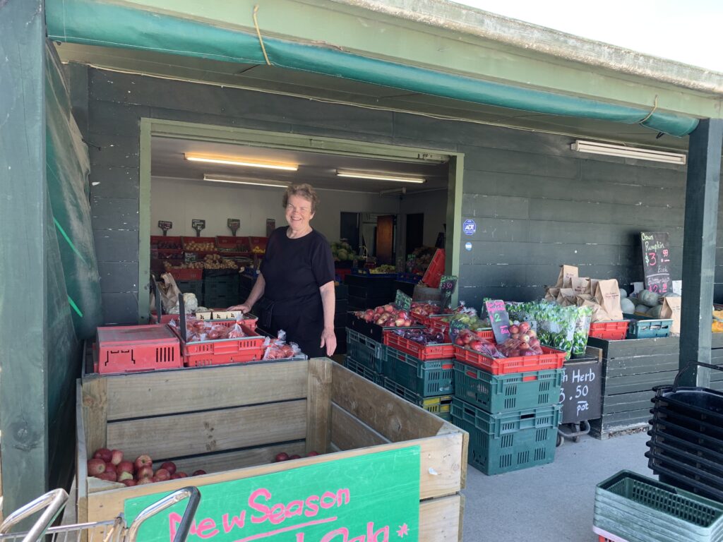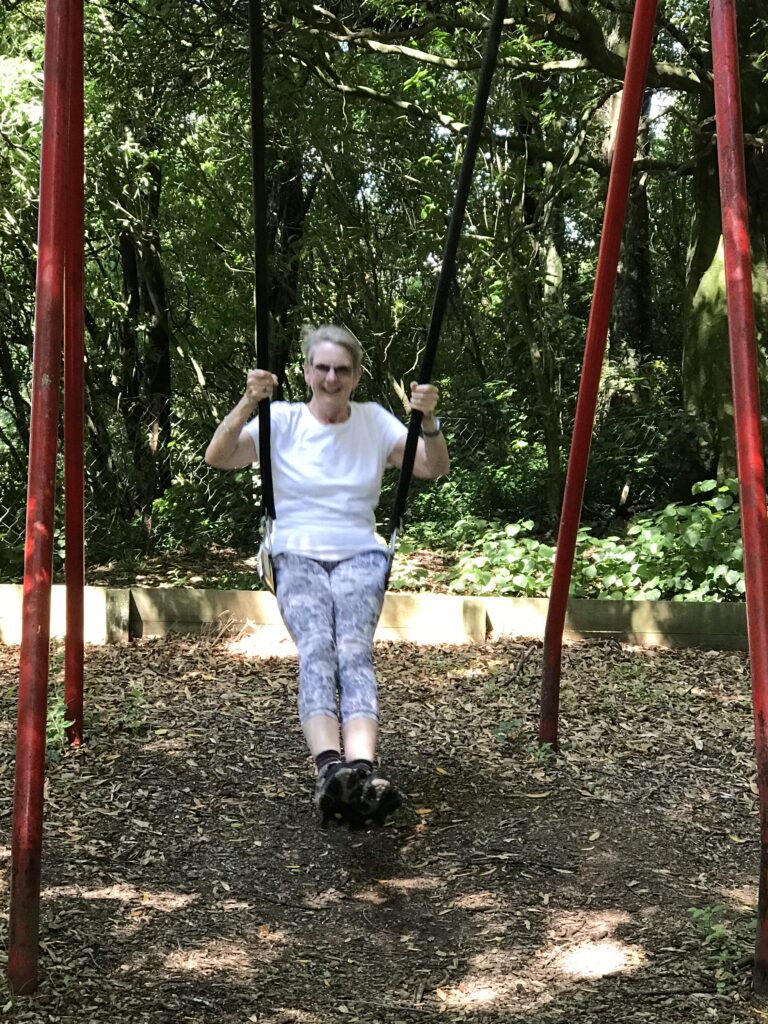 On the road again the landscape kept changing as it tends to do here. Mountains in the distance, hills nearby, pastures with sheep and cattle, forests, and rivers. The roads are in great shape, with lots of road work being done. Near a river gorge we found an old play area with a few picnic tables nestled into the trees. Looked like a perfect lunch stop to us. We set up in our usual fashion, using trash bags for our table cloth and enjoyed eating bug-free. But the children’s play equipment called to the child in both of us. Onto the swings we went for a fun bit of frolic then onto the seesaw. A bit more of a challenge. We crossed the bridge over the gorge, which like most rivers we’ve seen, was barely flowing. They’ve had a significant shortage of rain recently. Further on we came across a roadside fruit and vegetable stand. Inside we found a bounty of goodies and bought few for our eating pleasure. We were sorry we aren’t able to cook more here with the fresh abundance available.
