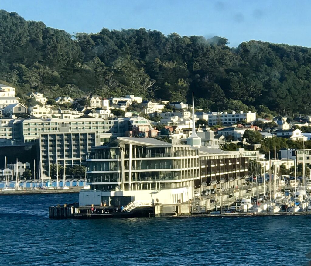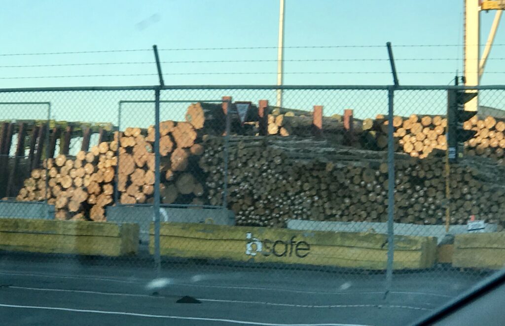 We were only a mile and a half away from the ferry but still saw only steep hills and not a bit of water or a boat. Then, boom! There was the ferry check in spot. Now, being from the Puget Sound area I’m accustomed to ferries. But this is not one of those! First off we had to book online ahead of time, then we had to be there and hour ahead of sail time. We tend to be early which has worked consistently in our favor. Cars were already lining up when we arrived just before 12:30 for our 1 pm check in. We sat in line for quite awhile when I finally said I was popping inside the building to use the bathroom. Just as I was coming out Dian was coming to get me to say the line was moving! And I’m the driver! We hopped in and snaked our way to the check in booth. Then we waited again. We clearly were not going to sail on time at 2 pm. Finally about 2:45 Dian did as I did earlier and went inside to use the facilities. And wouldn’t you know that’s exactly when they started to load the ferry! I drove up to the head of the line and explained what the situation was and the staff was kind enough to let me hold there until Dian walked out, assessed things and scurried down the holding lane. Going on board we were amazed to find all the semi trucks parked and facing backwards! This is not a drive on drive off kind of ferry. We had to drive on then turn in a U to be ready to drive off. Then we had to secure the car and head up to the passenger area as they close off the vehicle decks. We found a great table looking out ahead, having a beautiful, calm passage out of the Picton Harbor. Once we crossed into the Strait things began rolling a bit, but nothing too bad. After 3 1/2 hours we pulled into Wellington harbor. The offload went smoothly, passing through an industrial area, complete with an amazing amount of stacked logs. Guess that’s where all those logging trucks we passed were headed.