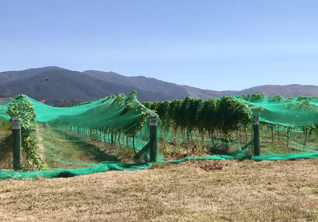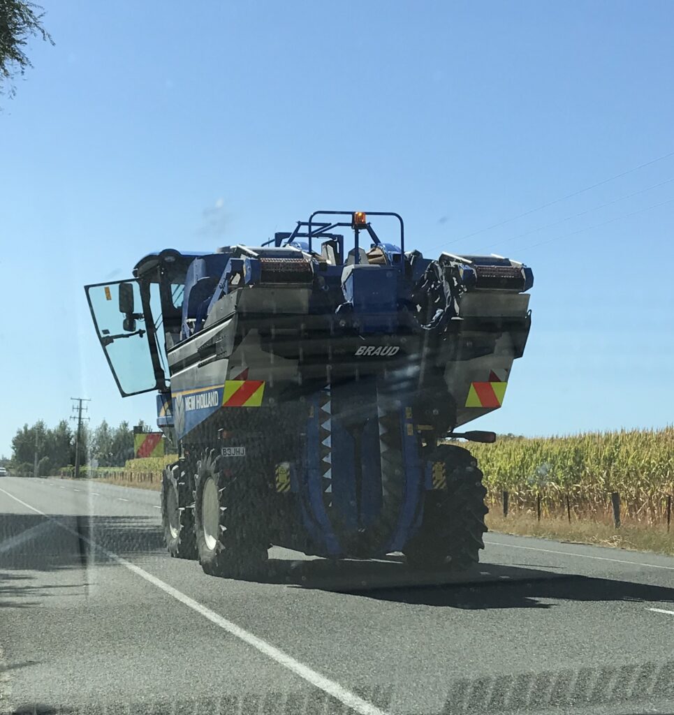We were surprised to find ourselves crossing up and over more mountains before coming across winery fields. We’ve been seeing many fields over the time here covered in netting, presumably to keep the birds from enjoying the grapes before us wine drinkers do. We were also amused to come up behind what appeared to be a grape harvester.